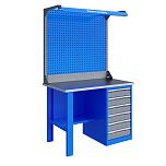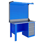 Однотумбовый. Допустимая нагрузка на столешницу 750 кг. Опорные элементы выполнены сварными из холоднокатаной стали. Верстак состоит из столешницы, опоры, тумбы P5 с четырьмя малыми и одним большим ящиком, полки-стенки, двойного экрана с кронштейнами и комплекта освещения. Все металлические элементы покрыты полиэфирной порошковой краской. Столешница из фанеры марки ФСФ толщиной 24 мм, которая покрыта лаком-антисептиком и листом оцинкованной холоднокатаной стали толщиной 1,2 мм. Размеры (ВхШхГ) 1965x1196x696 мм.