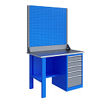 Однотумбовый. Допустимая нагрузка на столешницу 750 кг. Опорные элементы выполнены сварными из холоднокатаной стали. Верстак состоит из опоры, тумбы P7 с дверью и двумя полками и полки-стенки. Все металлические элементы покрыты полиэфирной порошковой краской. Столешница состоит из фанеры марки ФСФ толщиной 24 мм, которая покрыта лаком-антисептиком и листом оцинкованной холоднокатаной стали толщиной 1,2 мм. Размеры (ВхШхГ) 855x1196x696 мм.