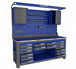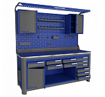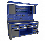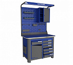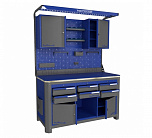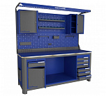 Нагрузка на столешницу 1500 кг. Столешница из листа влагостойкой фанеры марки ФСФ толщиной 40 мм и листом горячекатаной стали толщиной 5 мм. Рама верстака выполнена их холоднокатаной стали. Модуль верстака выполнен сварными. Ящики в модулях устанавливаются на шариковых телескопических направляющих полного выдвижения. Квадратная перфорация для установки крючков, держателей. Размеры: 1982x1993x743 мм.