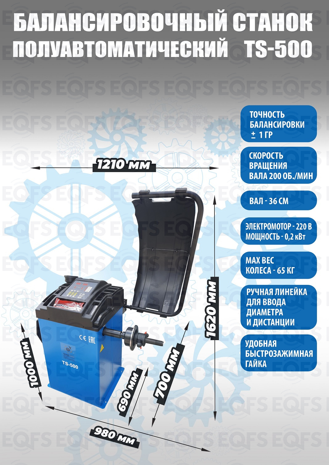 Полуавтоматический балансировочный станок TS-500 для колес легковых автомобилей, мотоциклов и легких грузовиков с диаметром диска с резиной до 760 мм. Размеры диска: ширина 3–9” (76-228 мм) , диаметр диска" -  10–21” (254-533 мм). Вал-36 мм. Максимальный вес колеса с диском – 65 кг. C кожухом. Точность ±1гр. Напряжение 220В. . В комплекте: кожух с автозапуском + клещи + кронциркуль + быстрозажимная гайка + набор конусов