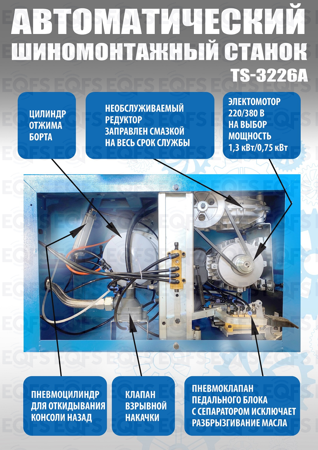 Автоматического шиномонтажного стенда TS-3226А предназначен для монтажа и демонтажа шин легковых автомобилей, внедорожников и легких грузовиков с размером колес 11-24 дюйма. Усилие пневмоцилиндра в 2500 кг. В комплекте: полноценная 3-й рука для работы с жесткой и низкопрофильной резиной RUNFLAT. + встроенный бустер  24 литра (взрывная подкачка) + пистолет для подкачки шин + монтажка + регулятор давления с влагоотделителем и манометром.