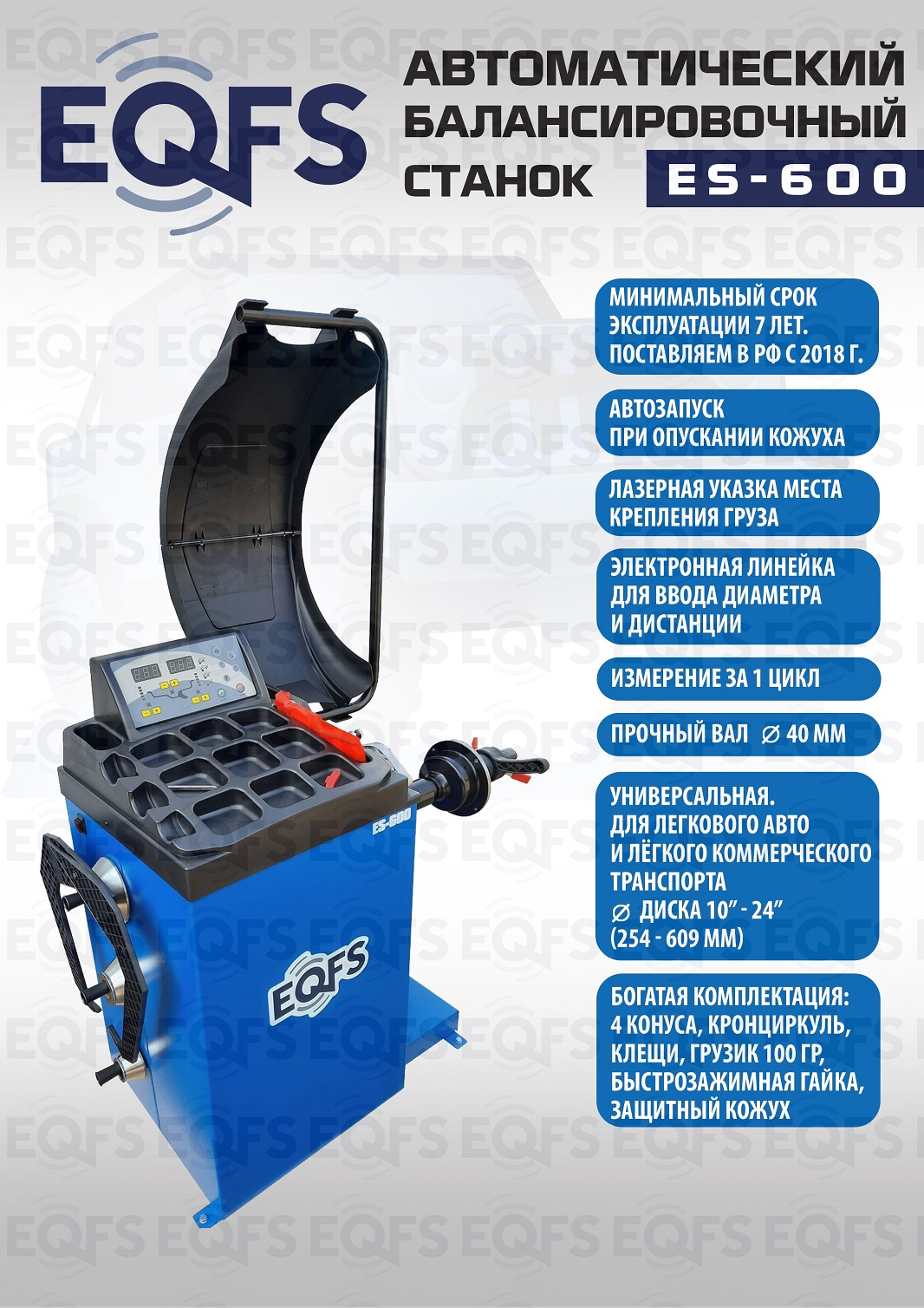 ES-600 Автоматический балансировочный станок. Для балансировки колёс легковых автомобилей, мотоциклов и лёгких грузовиков с диаметром диска с резиной до 800 мм. Размеры диска: ширина 3–10” (76-254 мм) , диаметр диска 10–24” (254÷609 мм). Прочный вал Ø - 40мм. Гарантия 18 мес – наш монтаж, 12 мес – самостоятельная установка. В комплекте: кожух с автозапуском + клещи + кронциркуль + быстрозажимная гайка + набор конусов.