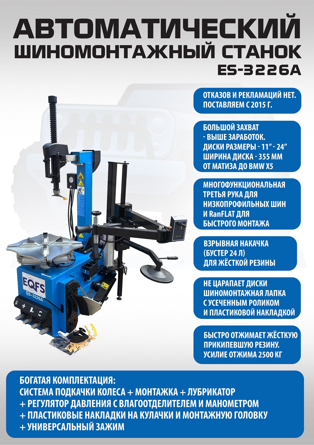 ES-3226A шиномонтажный станок Автомат. Взрывная подкачка, «третья рука» для работы с низкопрофильными шинами и RanFlat в комплекте. Диски: внешний зажим 11÷21", внутренний 12÷24". Для покрышек легковых автомобилей, внедорожников, «Спринтеров», «Газелей» и т.п.