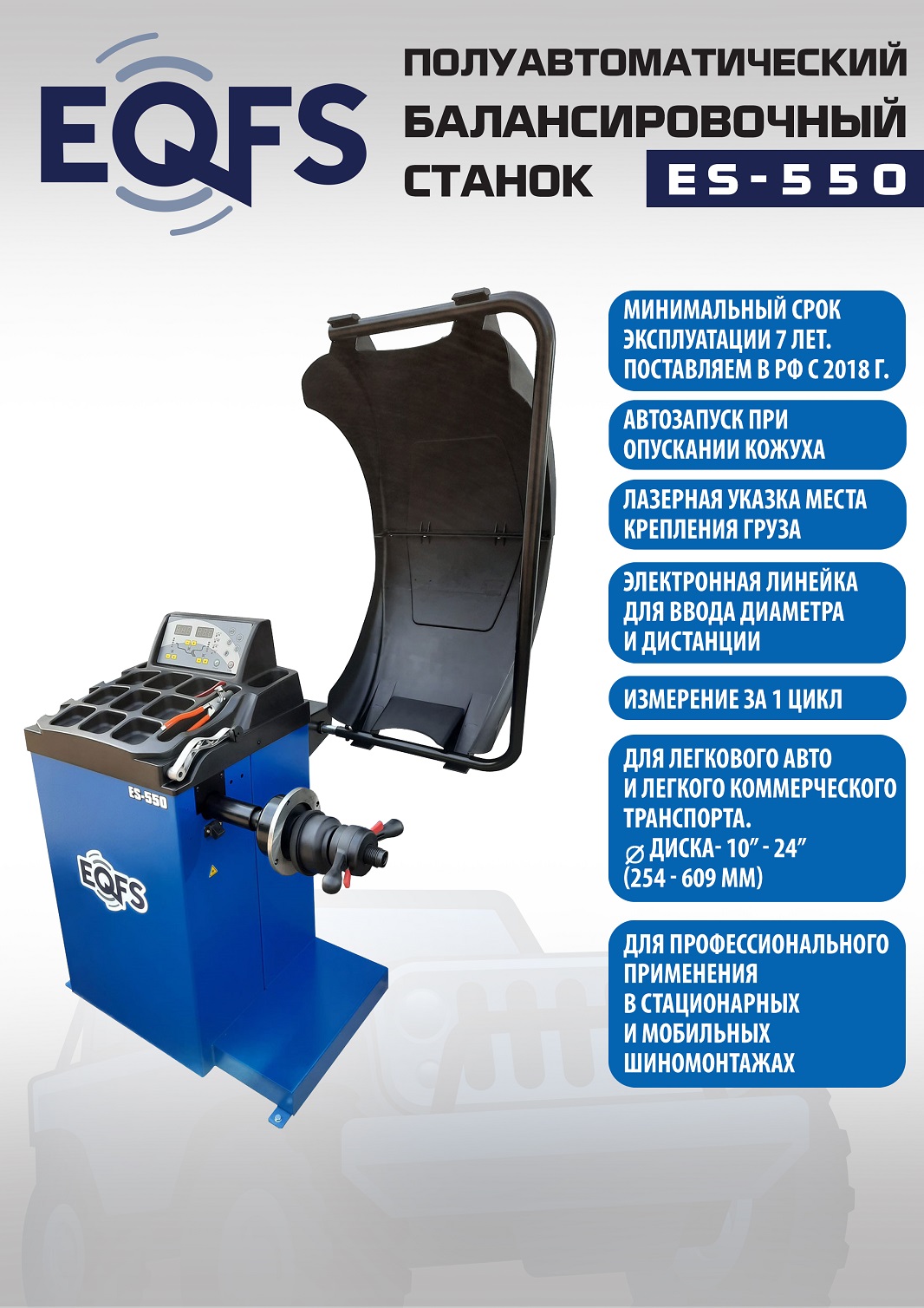 ES-550 Балансировочный станок. Полуавтомат. Удобный и понятный интерфейс. Автозапуск опусканием кожуха. Автоматический ввод дистанции и диаметра диска. Лазерная навигация. Автокалибровка. Для колес легковых автомобилей, мотоциклов, «Газелей», «Спринтеров» с диаметром диска с резиной до 800 мм. Размеры диска: ширина 3–10” (76-254 мм) , диаметр диска 10–24” (254÷609 мм). Вес ≤ 65 кг. Вал- 36 мм. Точность ±1гр. 220 В. Режимы работы DINAMIC, STATIC, ALU1, ALU2, ALU3, ALUS, ST. Гарантия 12 мес.