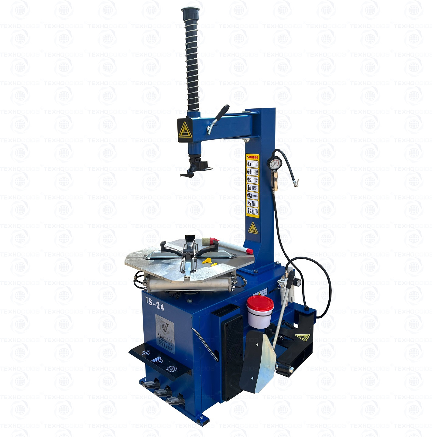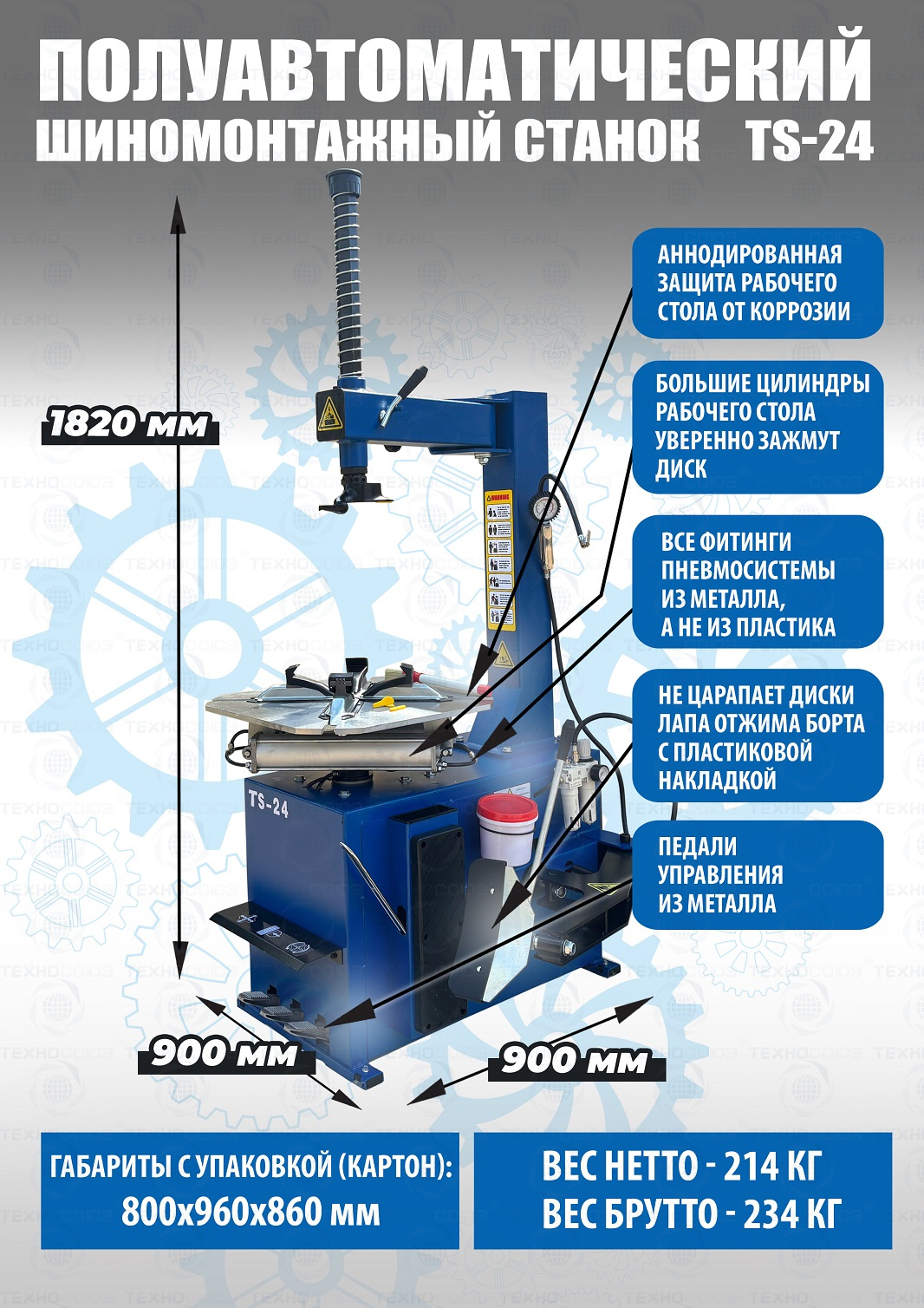 Шиномонтажного станка TS-24. Полуавтоматический. Квадратный стол. Для дисков:11÷24”. Усилие отрыва покрышки 2700 кг. В комплекте: пистолет для подкачки шин + монтажка + пластиковые накладки на зажимные кулачки + регулятор давления с влагоотделителем и манометром. Напряжение шиномонтажных станков 220В или 380В на выбор.