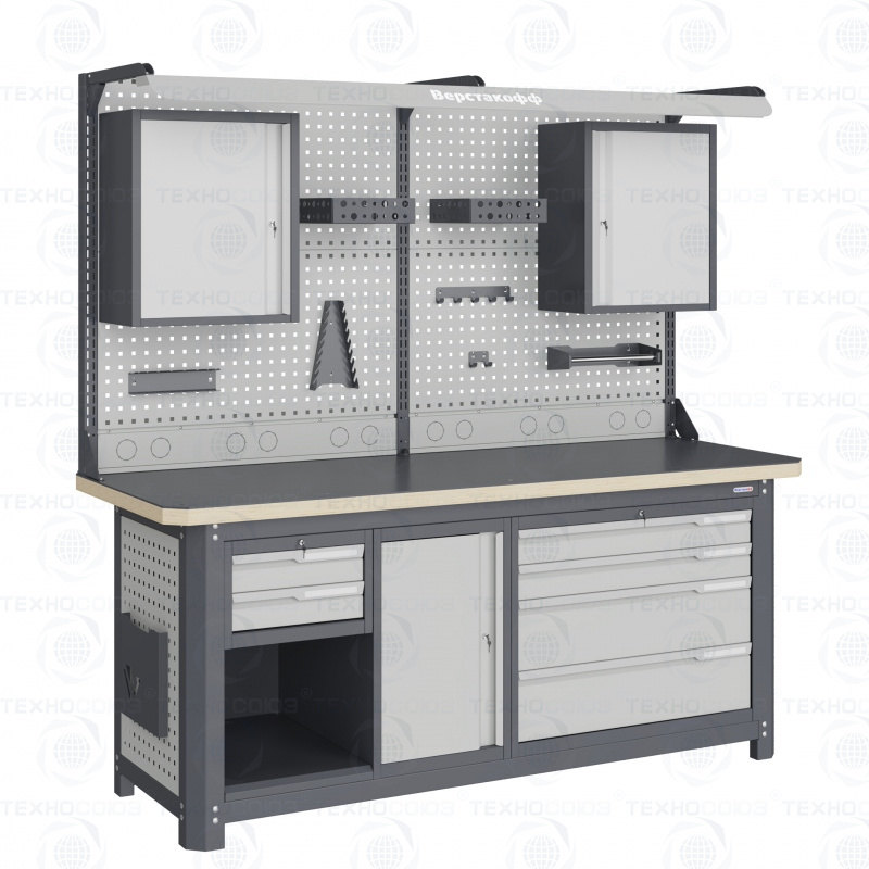 Нагрузка на столешницу 1500 кг. Столешница из листа влагостойкой фанеры марки ФСФ толщиной 40 мм и листом горячекатаной стали толщиной 5 мм. Рама верстака выполнена их холоднокатаной стали. Модуль верстака выполнен сварными. Ящики в модулях устанавливаются на шариковых телескопических направляющих полного выдвижения. Квадратная перфорация для установки крючков, держателей. Размеры: 1982x1993x743 мм.